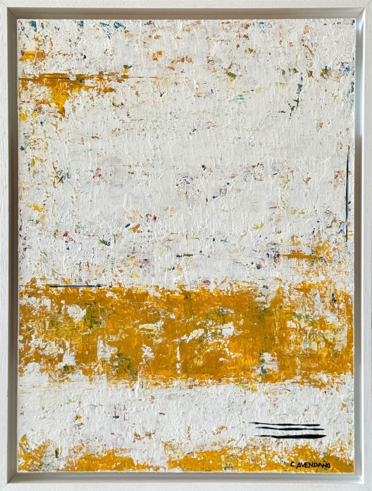 En el segundo panel, las líneas de color amarillo vibrante emergen de forma más prominente, dominando la superficie. Es una zona de mayor energía visual, donde el color se ha asentado de manera más rotunda. A pesar de la viveza del amarillo, el fondo aún mantiene la misma paleta suave y casi etérea del primer panel, lo que sugiere que la ilusión se mantiene, pero con una nueva intensidad. La transición de texturas entre los dos paneles es notable, pues aquí la superficie es más fragmentada, lo que crea una sensación de caos controlado. Hay una contradicción entre la vibración del color y la textura irregular, lo que sugiere que la ilusión es un fenómeno que no es uniforme ni estable.